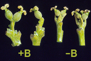 Fragmentos necróticos grandes e irregulares se desenvolvem entre as nervuras, principalmente nas folhas novas apicais. Quando a deficiência de boro é grave, as folhas ficam torcidas e as nervuras bastante proeminentes. O perecimento das extremidades dos brotos resulta em ramos sem folhas muito pronunciados. As nozes não se desenvolvem adequadamente e pode-se esperar uma redução significativa na produção. As nogueiras normalmente não precisam de suplementação com boro até atingirem a idade de reprodução (12 anos)